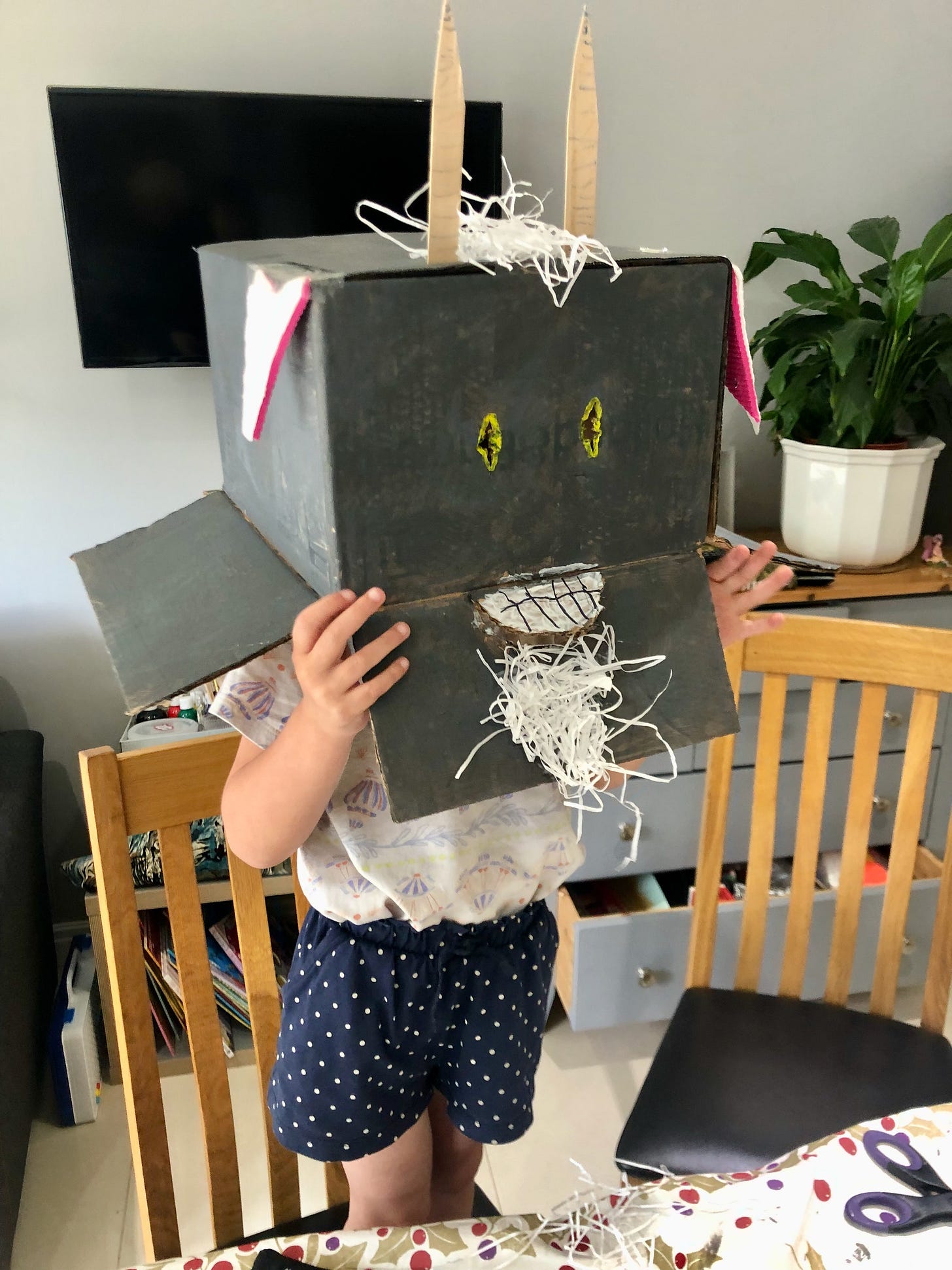 At our local home-ed co-op, the children used picture prompts to co-create a story framework. They then moved into a space filled with costume accessories — hats, scarves, capes, masks, trinkets — alongside a craft area where they made pop-out dragons. Watching them naturally weave props, characters, and plot together through play was a joy.